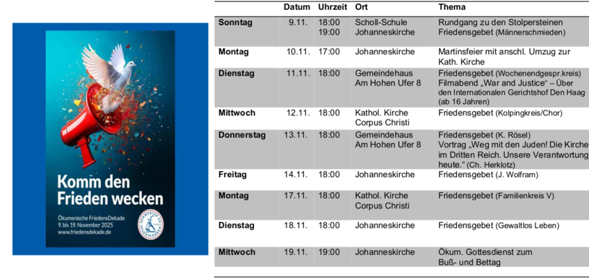 Wie in jedem Jahr laden wir ein zur Ökumenischen Friedensdekade. Gemeinsam mit der Katholischen Kirche laden wir ein zu Friedensgebeten. Wir beginnen mit einem Rundgang zu den Stolpersteinen und zu jüdischen Erinnerungsorten in Saalfeld am Tag der Pogromnacht, am 9.November. Gerade in dieser Zeit ist es wichtig, unsere Verbundenheit mit Juden in Deutschland und weltweit deutlich zu machen. Das Thema der diesjährigen Friedensdekade heißt: „Komm den Frieden wecken.“Zum Abschluss findet wieder der Gottesdienst am Buß-und Bettag statt.