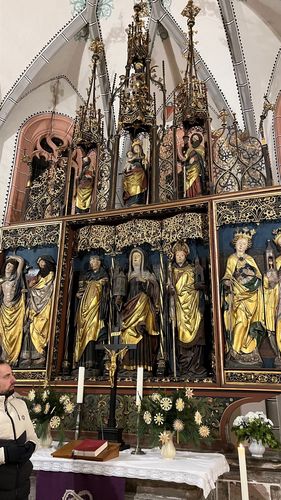 Wikipedia:“ 1477–1479 wurde der neue Turm mit Spitzhaube errichtet. Zwischen 1510 und 1520 wurde der spätgotische Chor gebaut.“ und der Altar errichtet. Um 1770 wurde der Altar demontiert und auf dem Kirchenboden zwischengelagert. Ab den 30 er Jahren des 20. Jahrhunderts erfolgte der Wiederaufbau des Altars. Die Erläuterungen von Herrn Wagner lösten nach dem Abendbrot eine längere Diskussion aus.